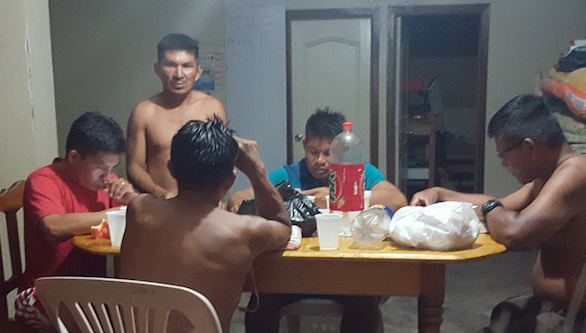 Segundo, here in the red shirt, came to our house after hours to hold a Bible study with these 4 Yine leaders.
